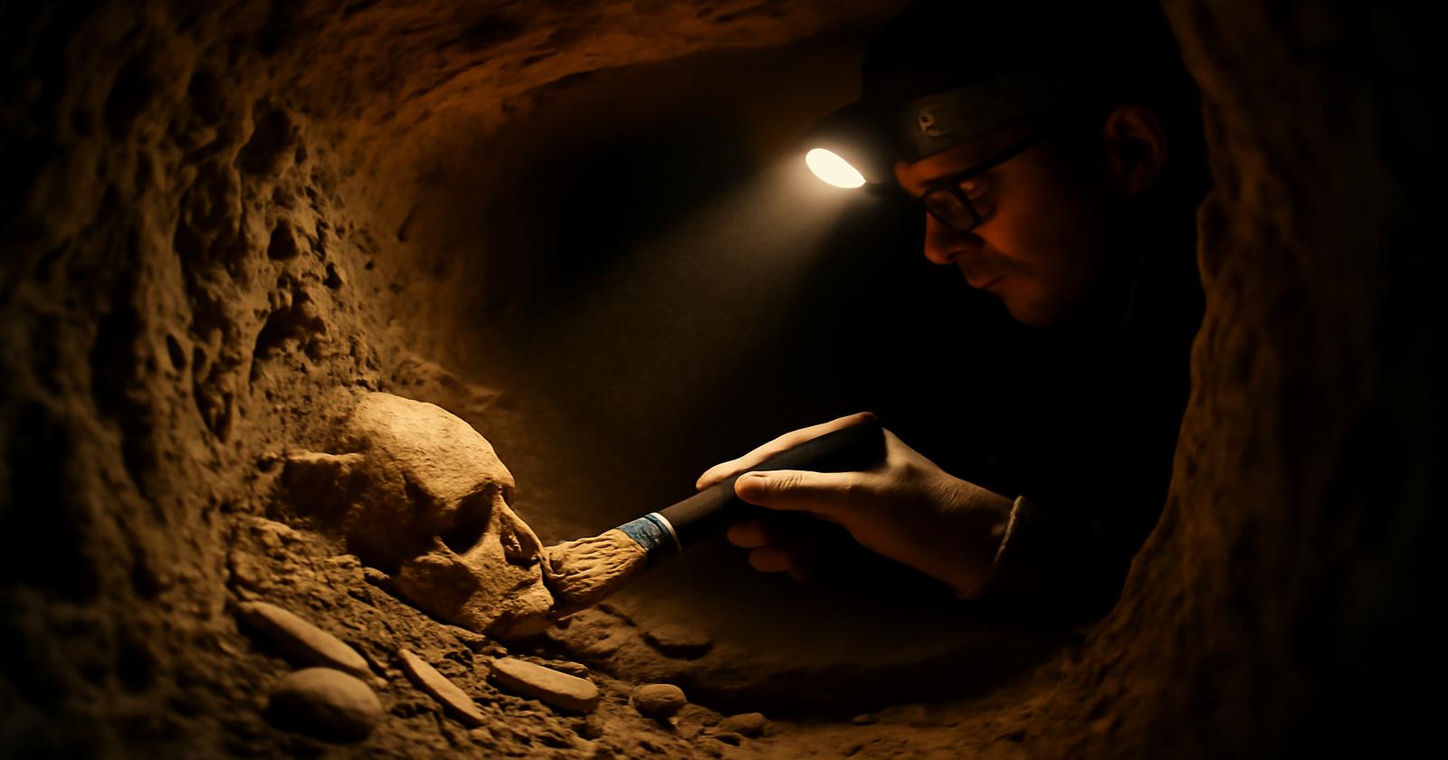 Als die Ausgrabungsleitung eine größere Fläche öffnet, kommt die Wahrheit schrittweise ans Licht: Es ist ein Tunnel. Ein schmaler Gang, gemauert, mit sorgfältig gesetzten Steinen, groß genug, dass ein Mensch gebückt hindurchgehen kann. Der Verlauf: wie eine unterirdische Narbe, die quer durch das 6.000 Jahre alte Gräberfeld zieht. Wo der Tunnel läuft, sind die steinzeitlichen Gräber brutal gekappt – Schädel, die knapp unter der Decke hinausragen, Gruben, deren Böden fehlen, als habe jemand ein unsichtbares Messer hindurchgezogen.